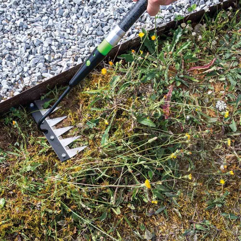 Efficacité redoutable : Un râteau de désherbage 6 dents pour un entretien précis des allées, massifs et potagers. Dites adieu aux mauvaises herbes !