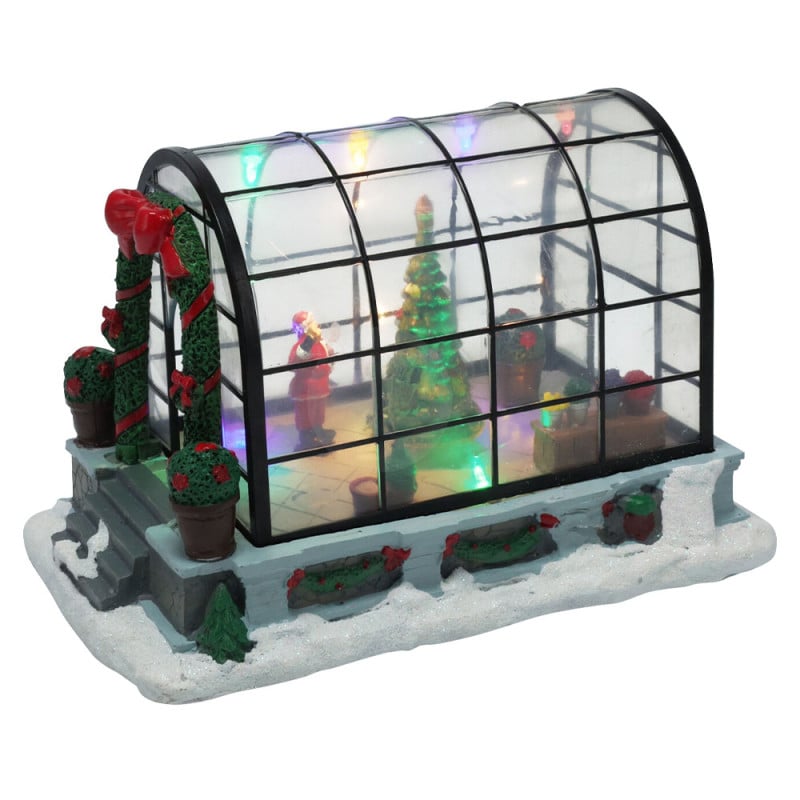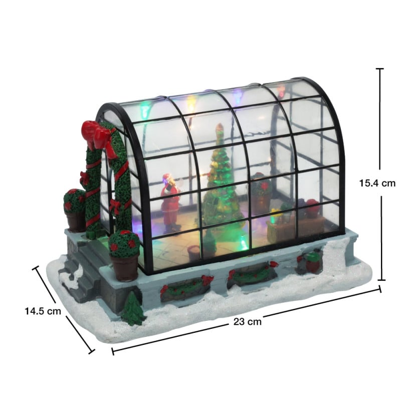 Voilà une scène magique pour Noël : une serre de jardin avec le Père Noël. Un format compact, qui fonctionne à piles, parfait pour votre déco intérieure !